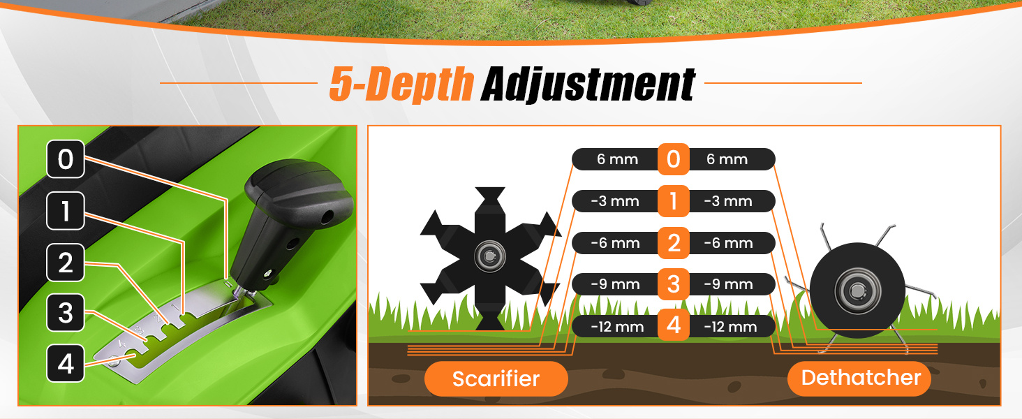 • 5-position depth control is suitable for a variety of lawn conditions