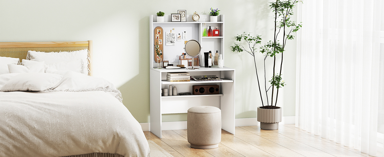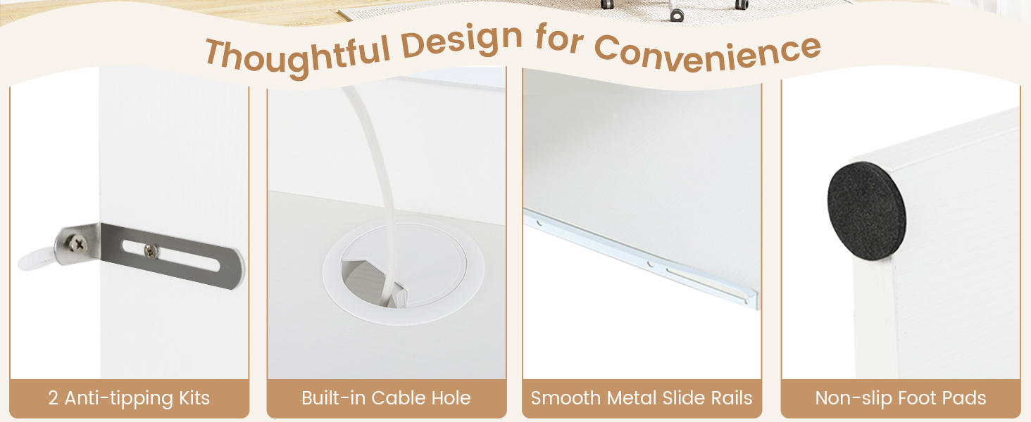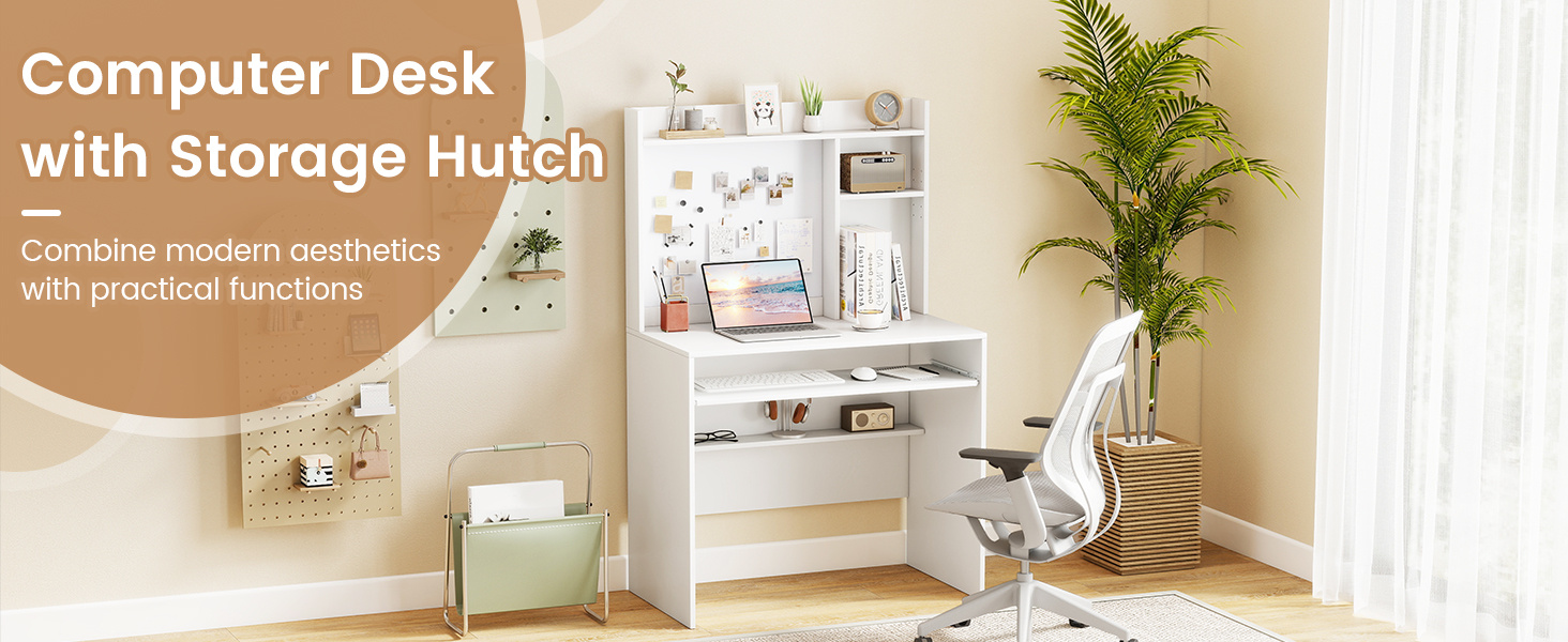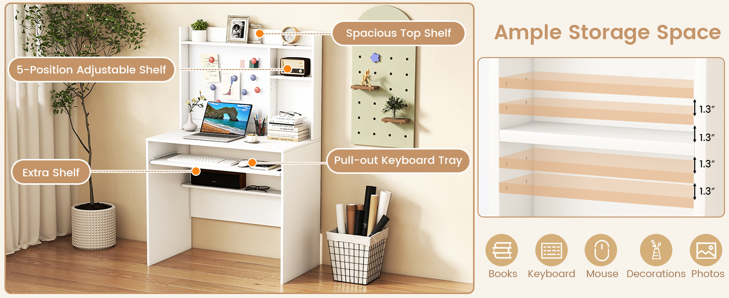 This desk has so many shelves that are adjustable a pull out shelf for keyboard or laptop great for work or studying it also comes with a plug on top built in with 2 plugs And two USB ports . Very clean looking, It’s perfect for small room, easy assemble, good quality,